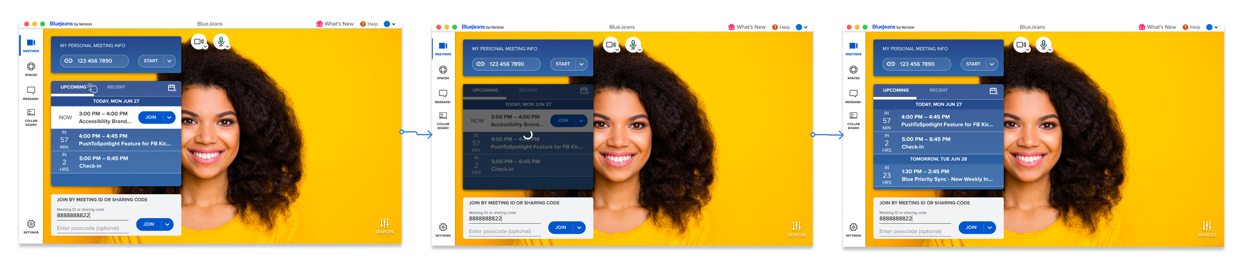 BlueJeans goal is to make video conferencing as easy and pervasive as audio communications and create visual experiences that people love. During this sprint we were solving for an intuitive, accessible way to manually refresh the upcoming meetings list.